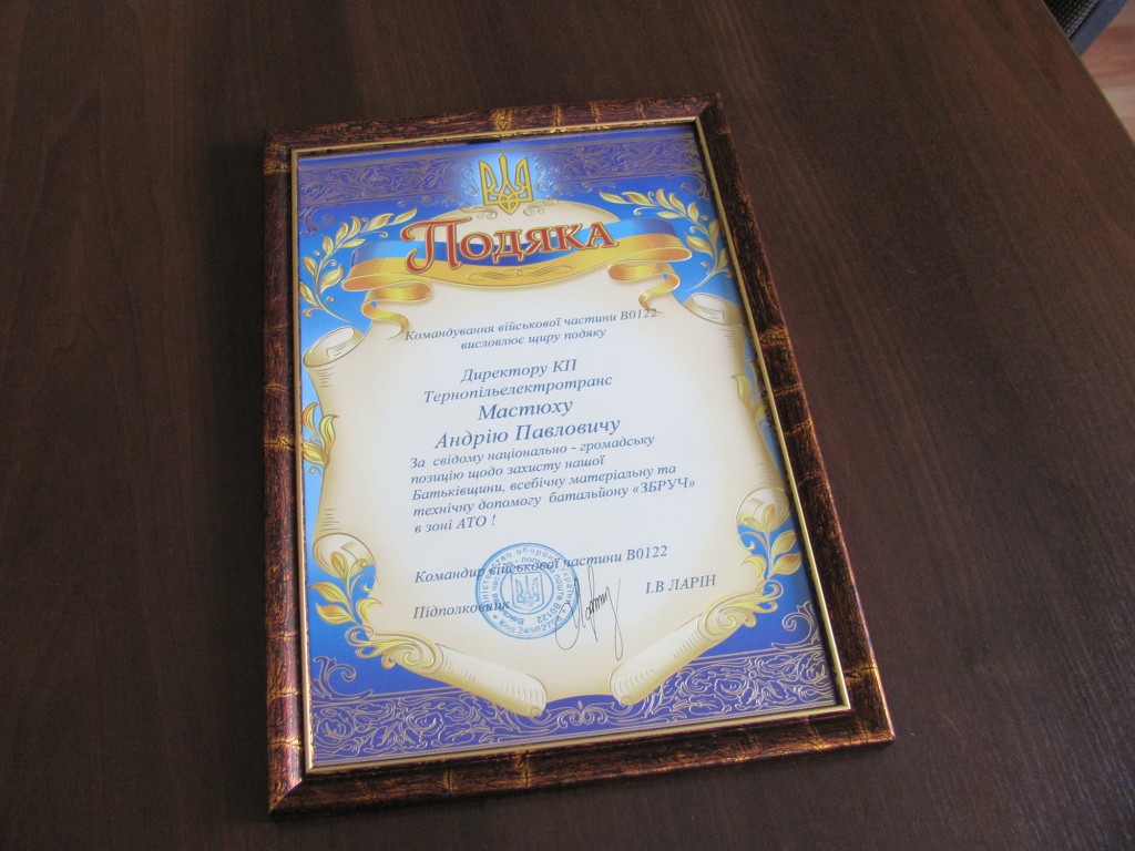 Сьогодні, 25 травня, директор КП «Тернопільелектротранс» Андрій Мастюх отримав подяку від командування військової частини ВО 122 (батальйон територіальної оборони Тернопільщини «Збруч»).